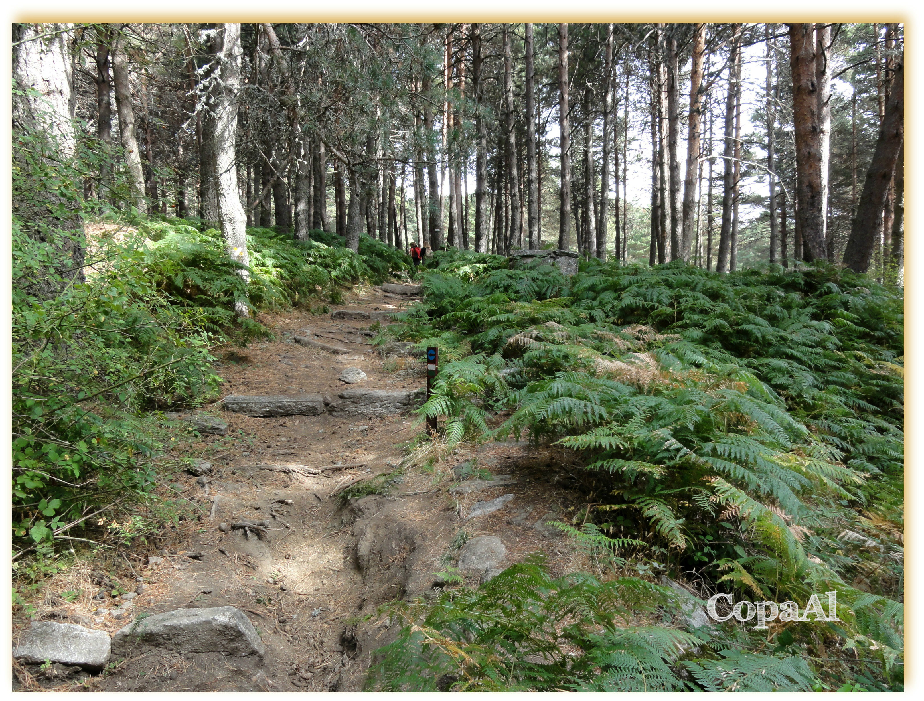 En el caminar, tendremos vistas de toda la llanura, desde la Maliciosa hasta Abantos. La pista se allana y se adentra en un espeso pinar, hasta encontrar un gran mojón tallado, por donde ascenderemos hasta la fuente de Aldara y un poco más arriba, a la peña con sus inscripciones y un ejemplar del Libro del Buen Amor dentro de una caja de madera.»
