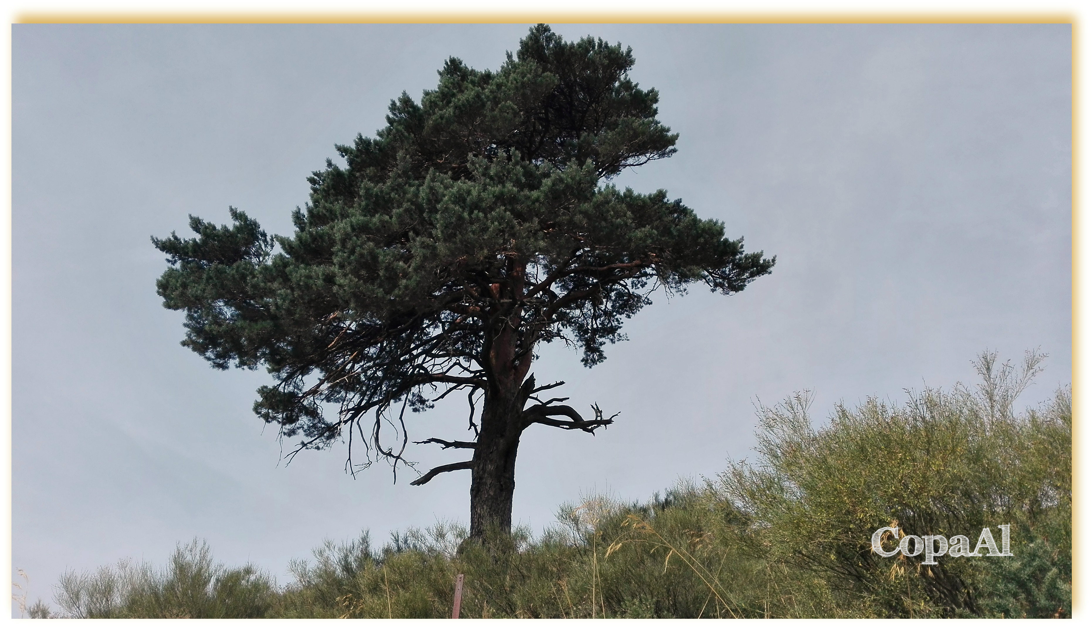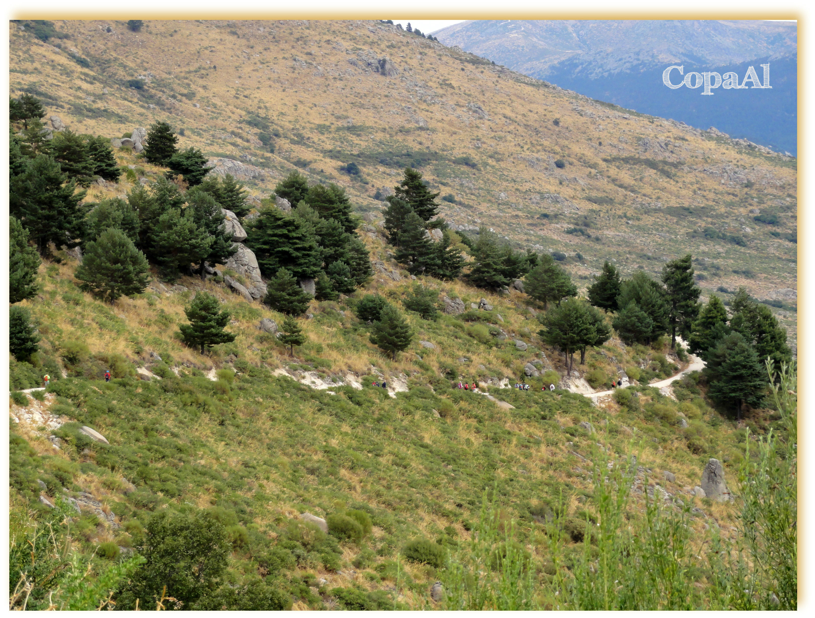 Bordeando los chalés, desembocaremos en una amplia pista forestal, que nos llevará en prolongado ascenso por la ladera de la riscosa Peñota, entre pinos solitarios y majestuosos.