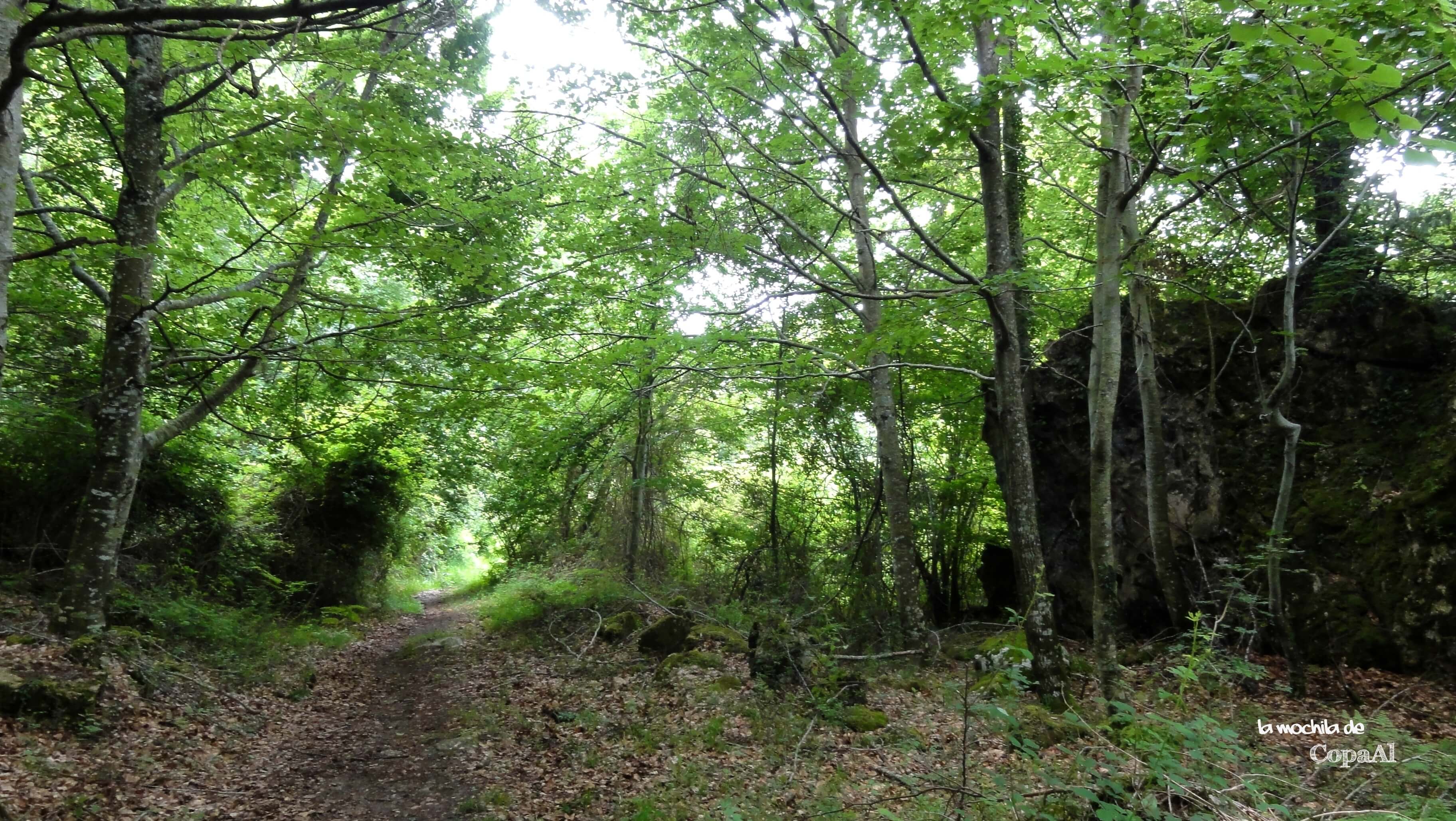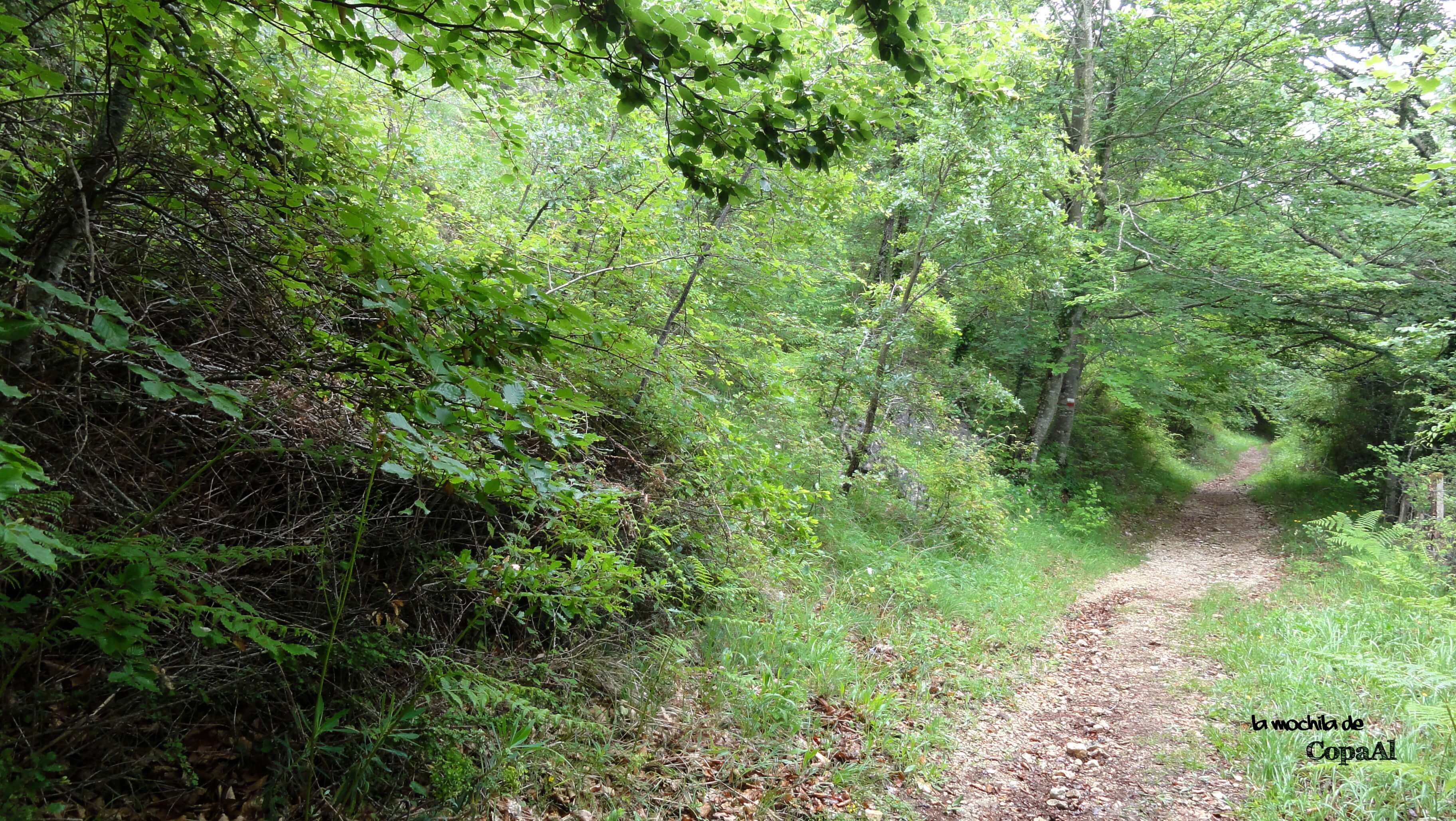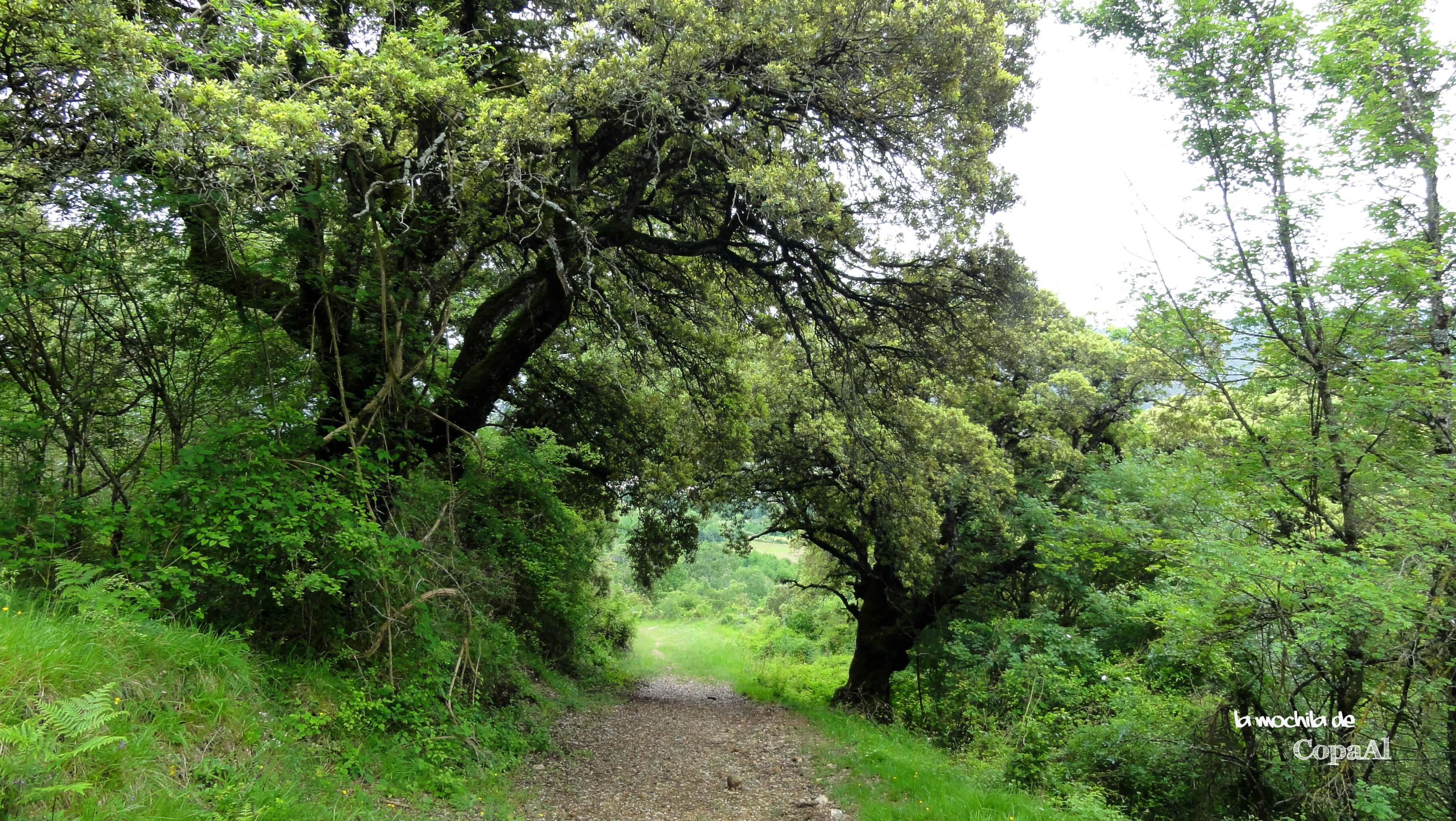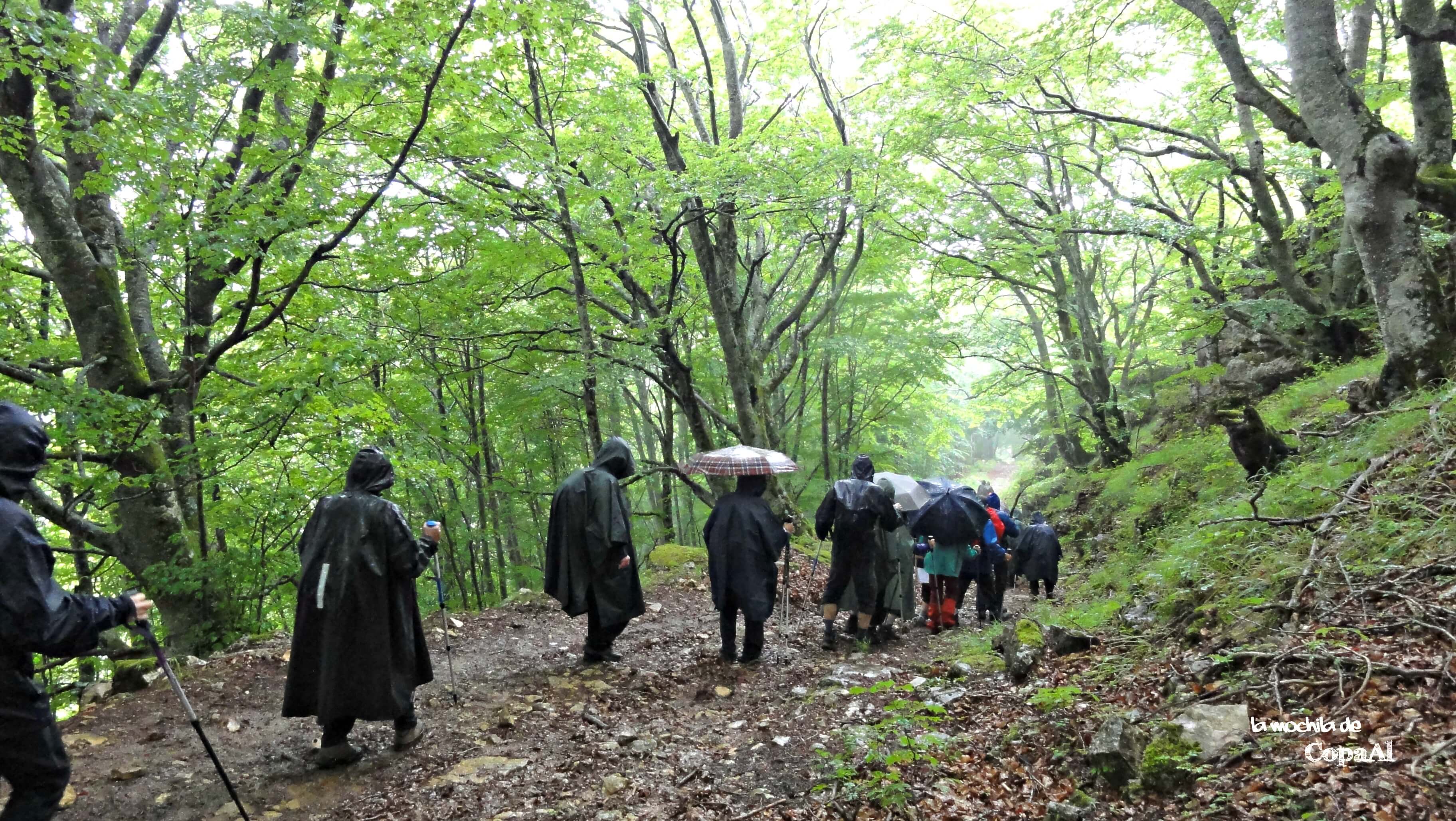Como era de esperar, la lluvia hizo acto de presencia y nos acompañó en nuestra bajada de regreso a Baquedano. El descenso lo realizamos por el camino del Puerto Viejo de Baquedano. El sendero desciende por la ladera del macizo hasta llegar al cruce del que partimos. Dada la pendiente, estrechez y pedregosidad del sendero en alguno de sus tramos, unido a la fina lluvia, hacía que la bajada necesitase de todos mis sentidos, para evitar un posible resbalón. A pesar de esta situación no podía evitar contemplar el sendero, que atravesaba un hermoso hayedo, y que según descendíamos se convertía en un bosque de encinas y quejigos, donde las gotas de lluvia adornaban sus bellas ramas pareciendo preciosas lámparas de cristal.