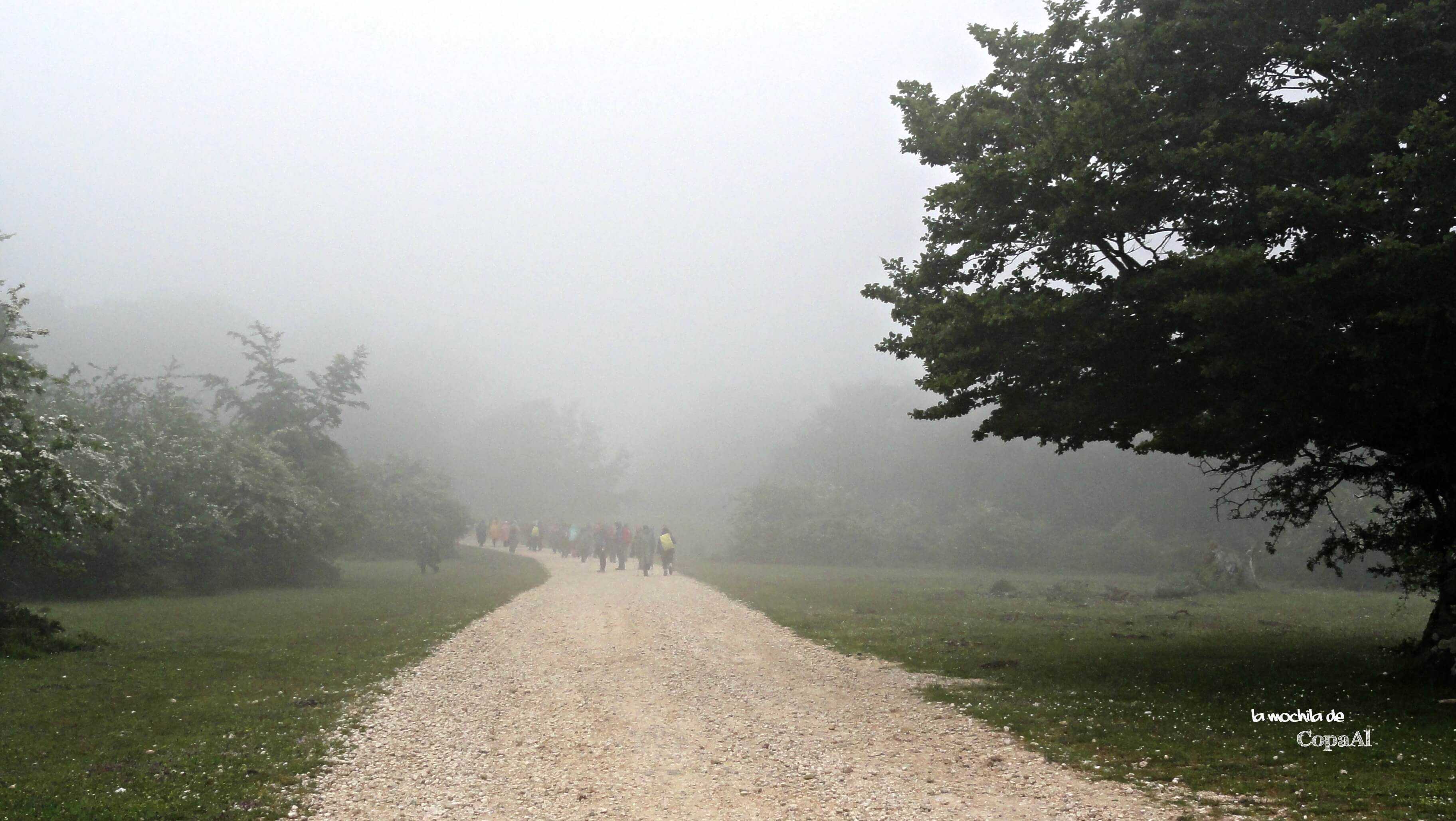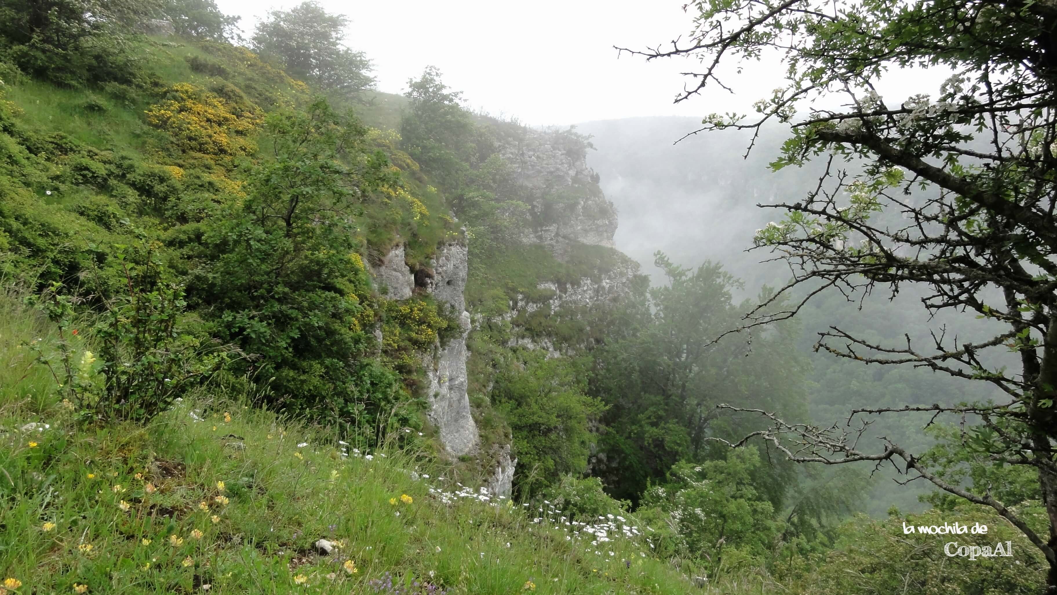 Cuando llegamos a la plataforma del macizo, el paisaje se había cubierto por una capa blanca de nubes que haría todavía más misterioso el valle, esta situación climatologíca, nos impidió bordear por el sendero el mirador del Balcón de Pilatos, donde seguramente hubiésemos disfrutado ante la contemplación del valle y los sonidos del agua del Nacedero del Urederra que ascienden por el acantilado rocoso hasta el balcón. En otra ocasión será posible.