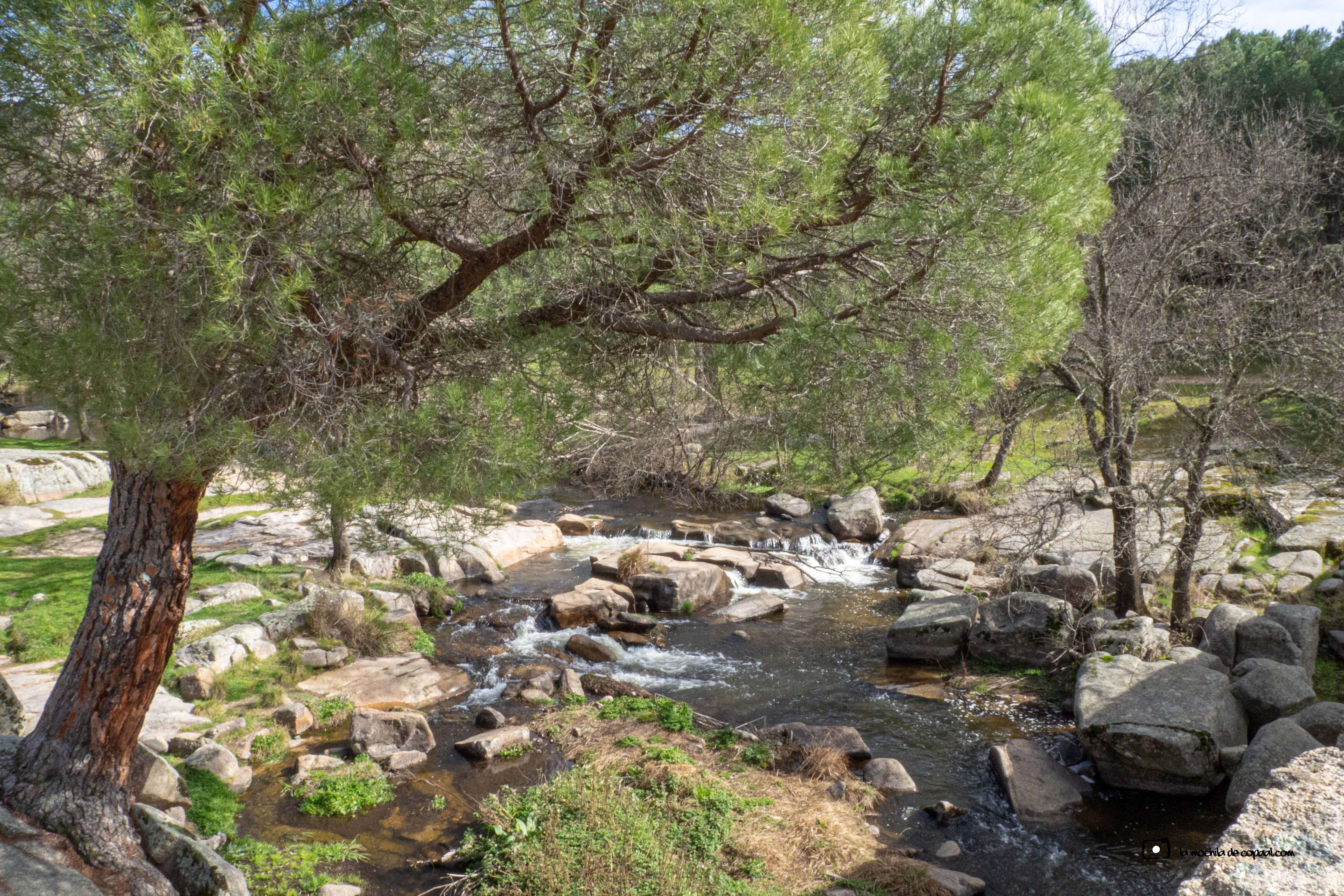 El descenso del sendero nos adentra de nuevo en el bosque de pinos, donde discurre el cauce de río Cofio. Su curso se vislumbra a ratos tranquilo y a ratos saltarín entre piedras de granito.
