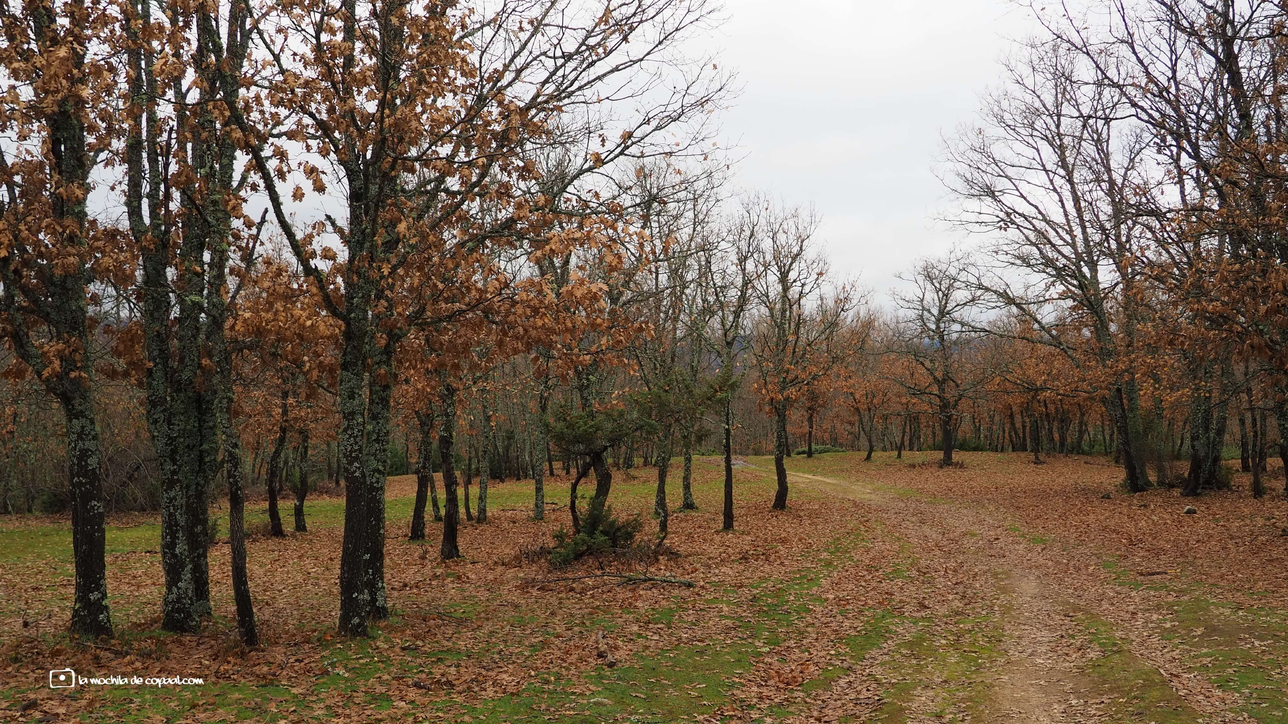 Nuestro itinerario discurre por un bosque de robles, cuyas hojas después del otoño han alfombrado el camino, vistiendo de tonos ocres la tierra.