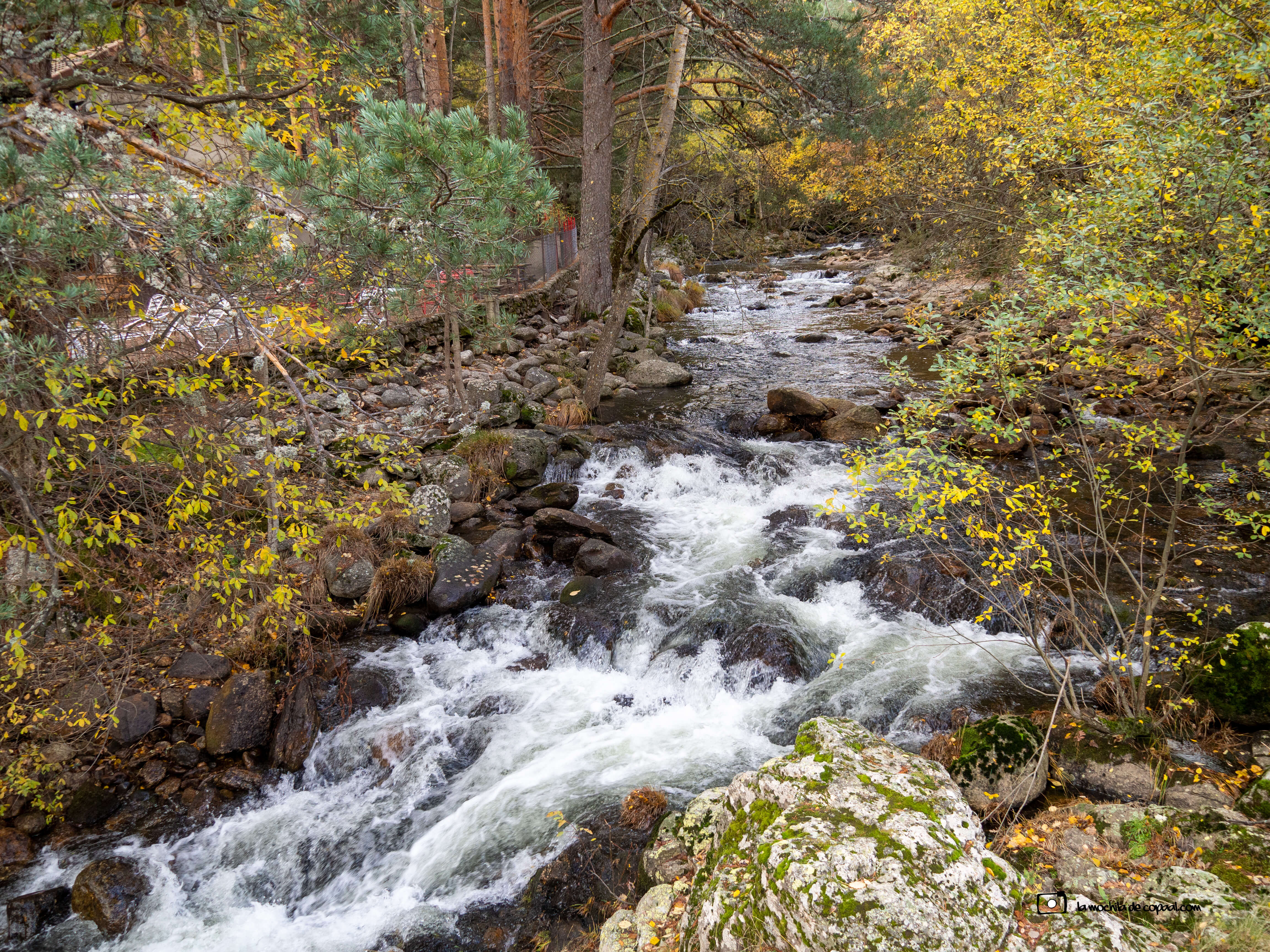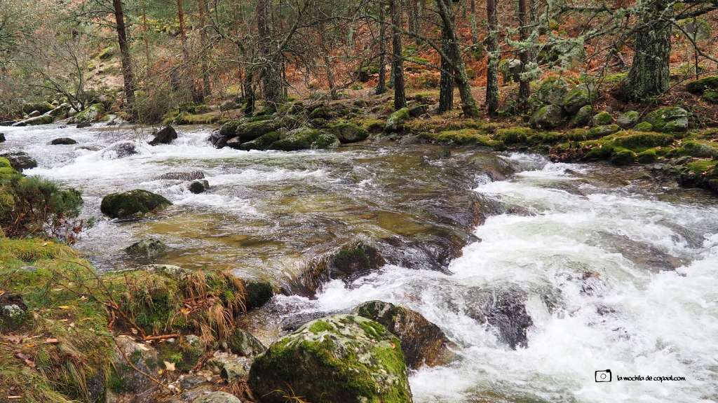 Me paro a contemplar como el curso del agua «gorgojea» a mis pies. El río se vuelve impetuoso al caer por la piedra granítica formando bellas cascadas y esculpiendo en ellas su paso.