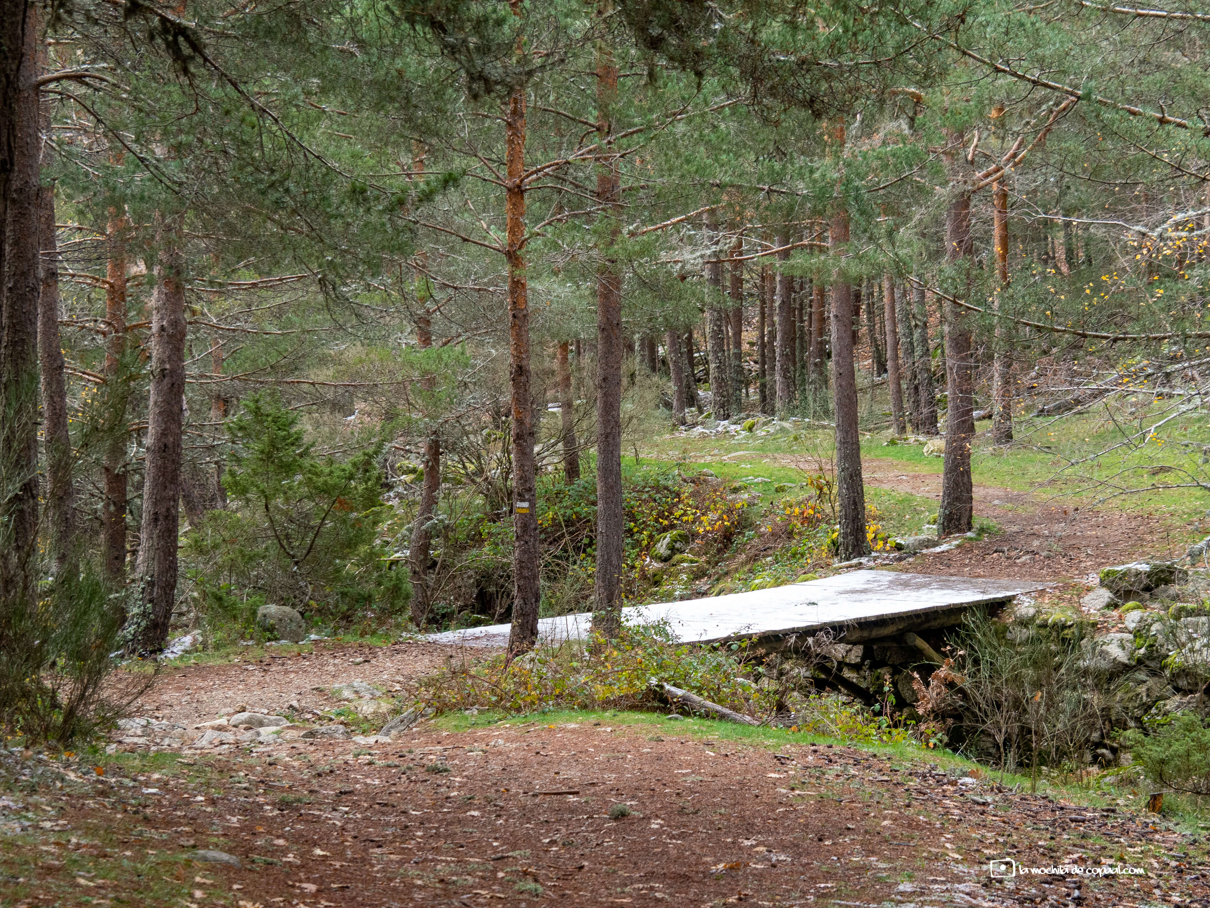 El sendero se engulle en el Pinar de los Belgas, donde los esbeltos troncos miran al cielo contemplando los primeros copos de nieve, que van tapizando la tierra.