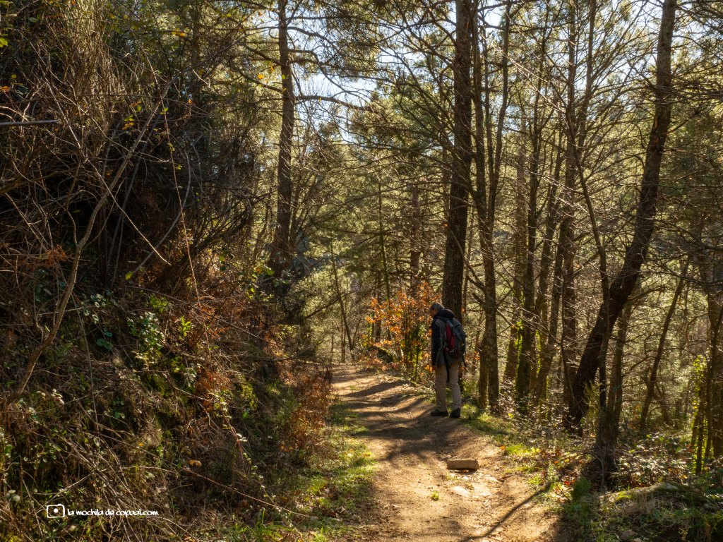 Bordeando la presa, para iniciar la subida a través de un sendero boscoso de pinos, que nos hacía coger altura, mientras las aguas del pantano seguían en total calma.