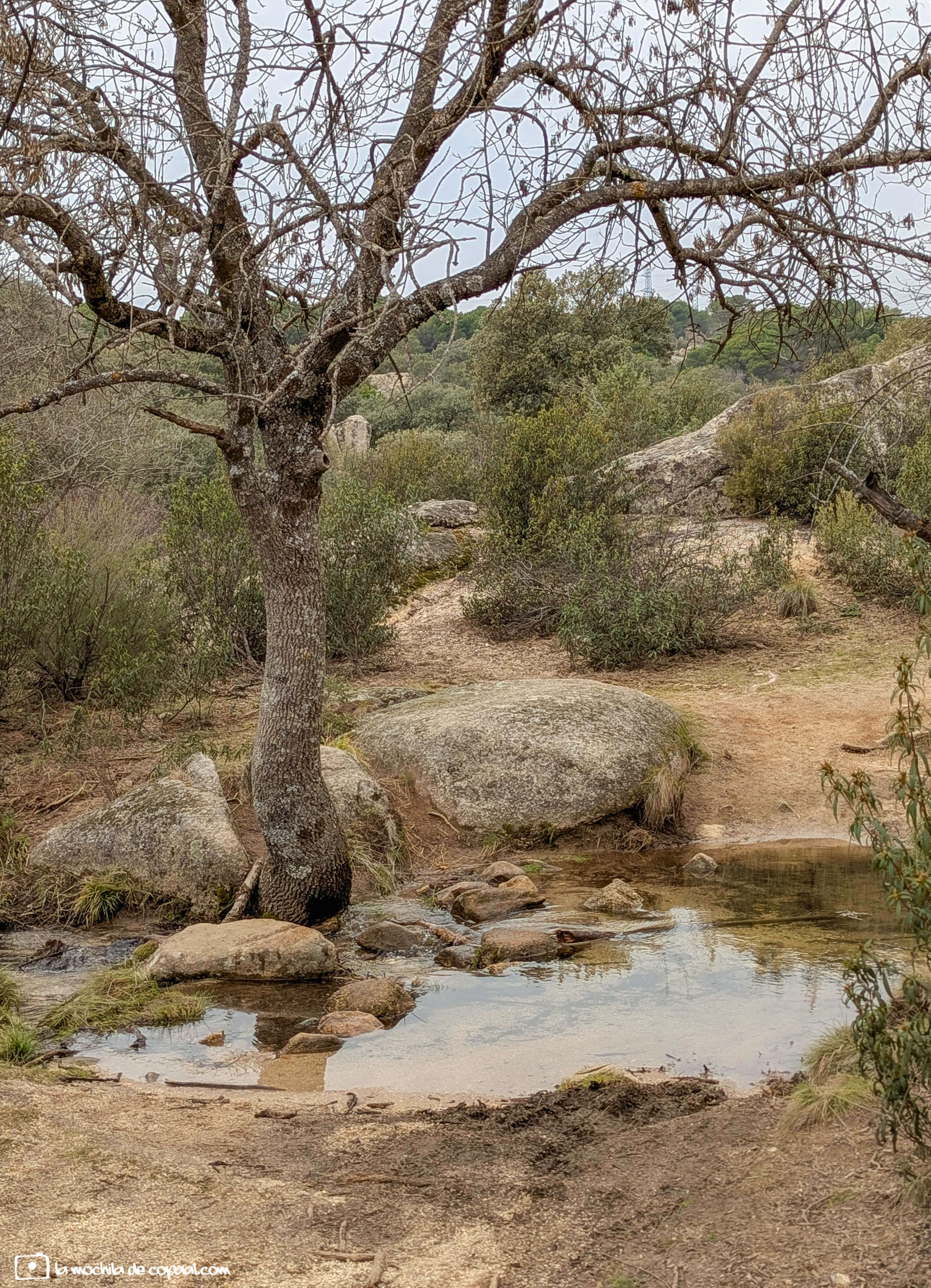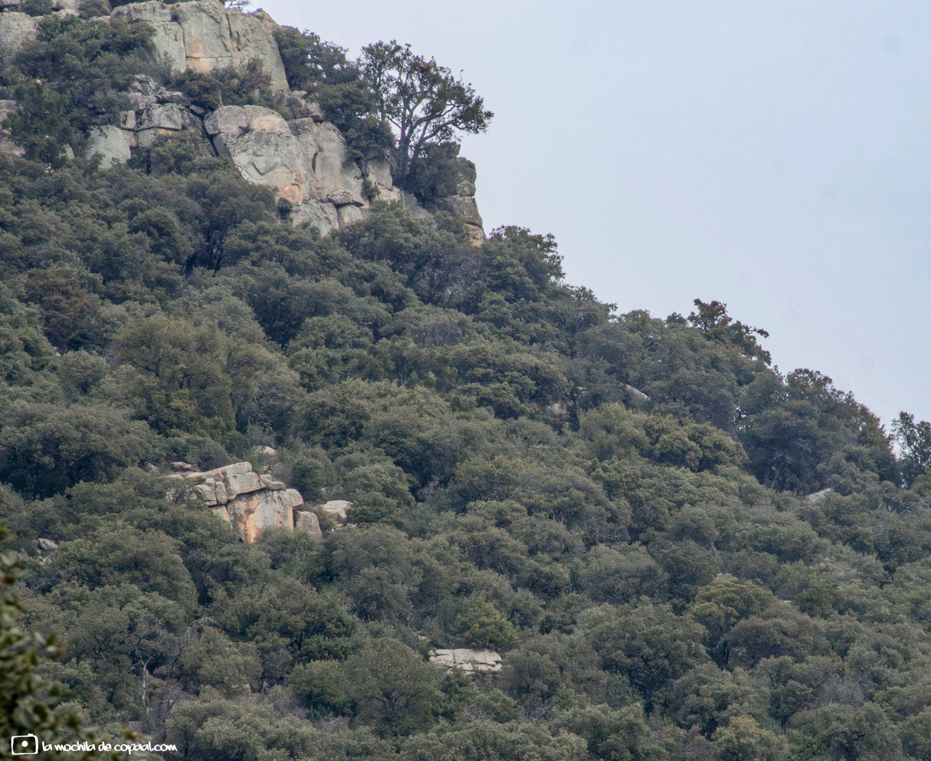 Contemplo a mi izquierda el llamado cancho de La Parra o La Tortuga por su similitud a tal animal (1368 mts.), mientras el camino se adentra en el pinar. El olor a primavera llega a mi mente, pensando en lo hermoso que debe ser este paisaje cuando la jara despliegue sus flores blancas.